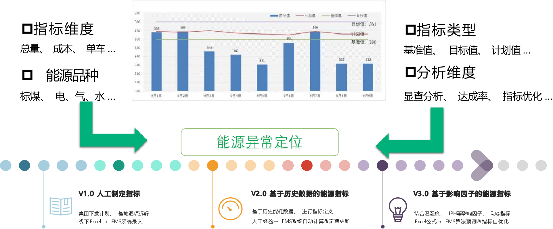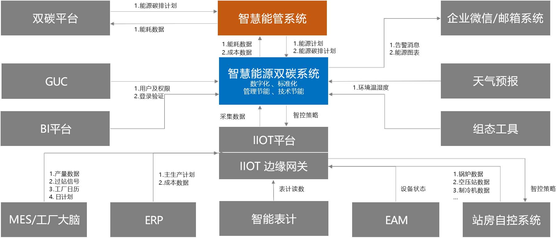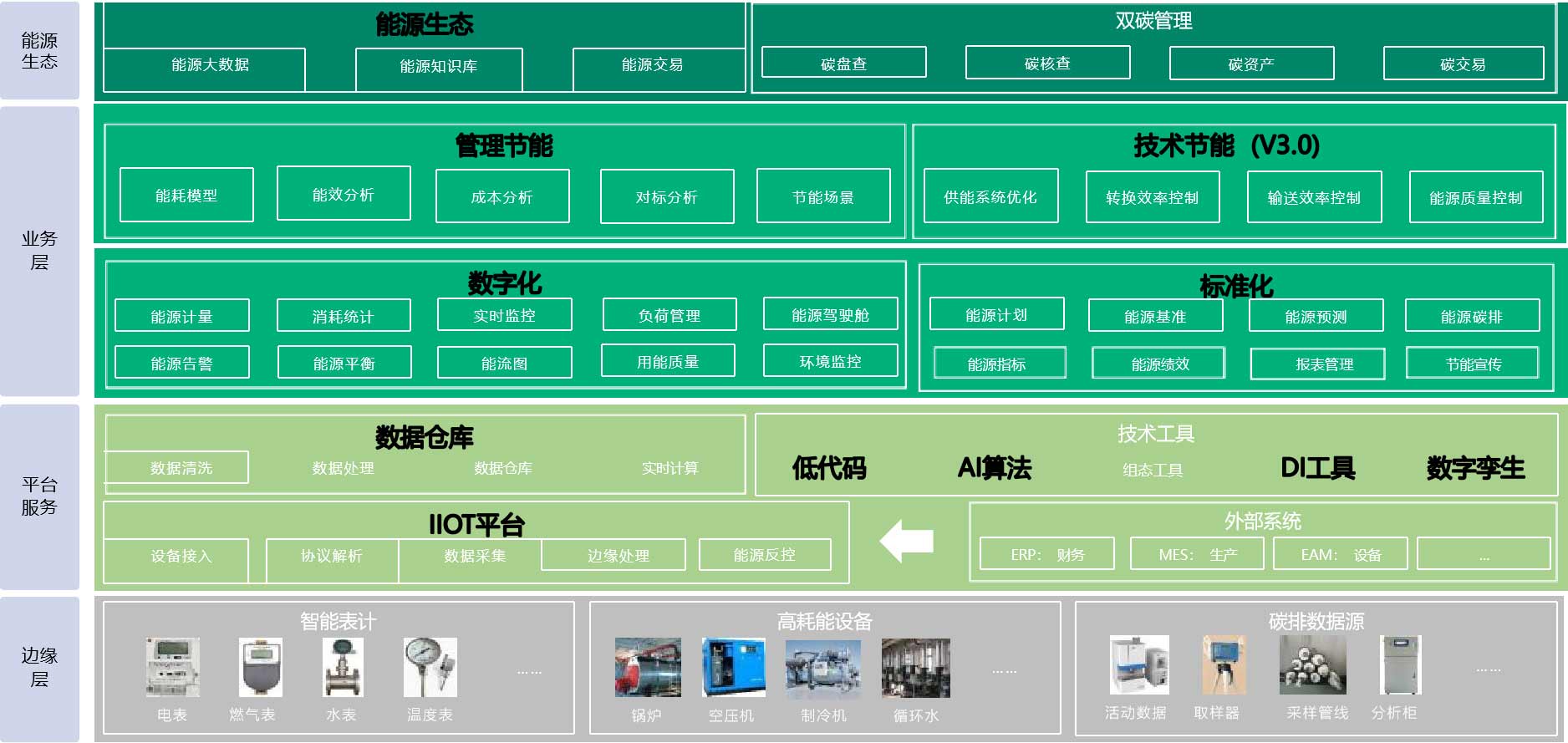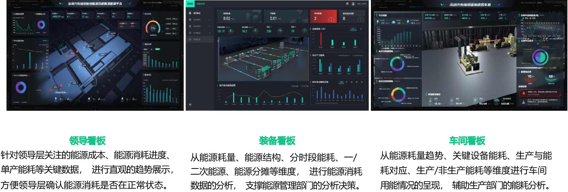 智慧能源雙碳系統(tǒng)從公司高層、能源部門、車間執(zhí)行三個(gè)維度,展示了分級(jí)管理決策界面,解決能源管理績效、過程、異常故障等不透明,輔助全員對(duì)能源系統(tǒng)進(jìn)行快速分析和決策。